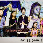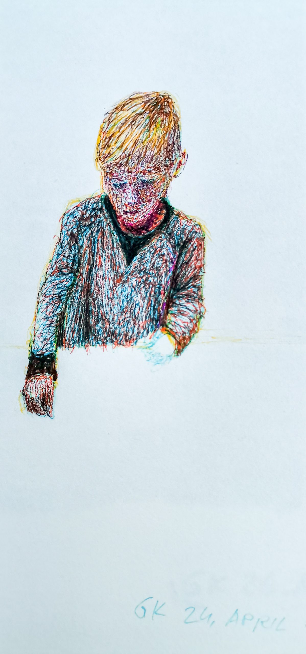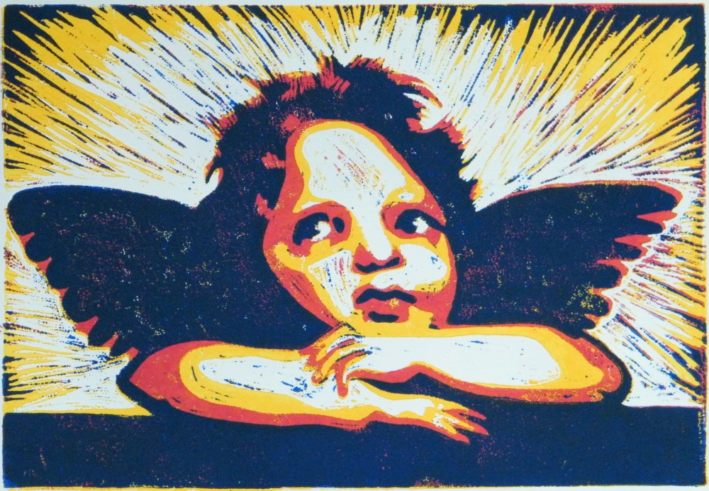 Engel, Kind, Knabe, Junge, Portrait, Grundfarben, Raffael, Sixtinische Madonna, Linoldruck,